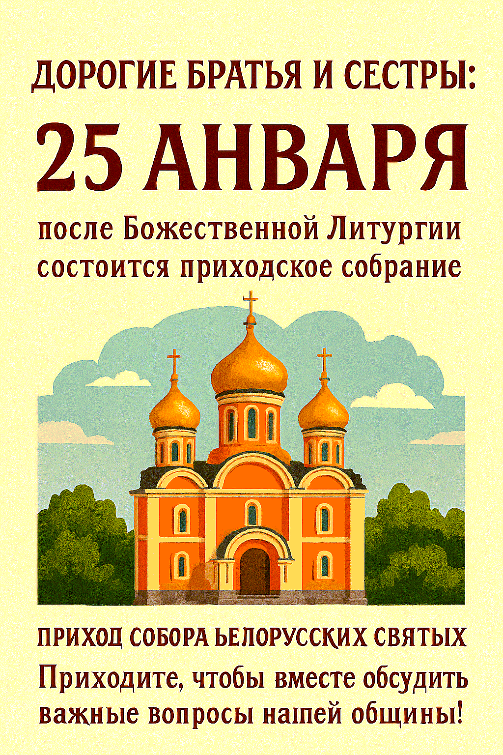 25 января на нашем приходе, сразу после воскресной Литургии, будет проведено ежегодное отчётное приходское собрание.
